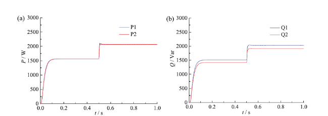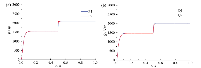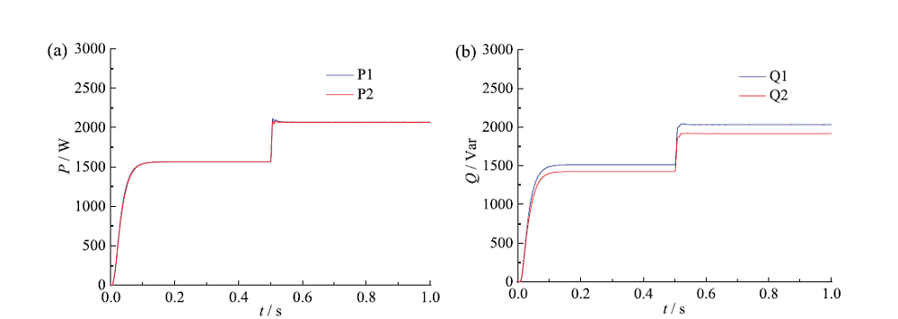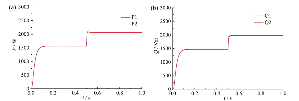 Fig. 11 Two VSGs output active (a) and reactive power (b) after improving VSG control strategy图11 改进后VSG控制策略:(a)两台VSG输出有功功率;(b)两台VSG输出无功功率 |