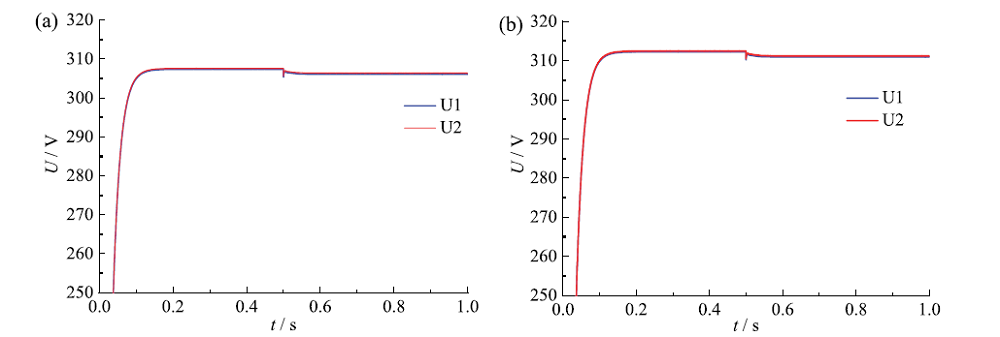 Fig. 13 Two VSG output voltage amplitude before (a) and after (b) compensation图13 补偿前(a)、后(b)两台VSG输出电压幅值 |