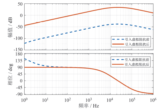 Fig. 8 Bode diagram of equivalent output impedance before and after introducing virtual inductor图8 引入虚拟阻抗前后等效输出阻抗伯德图 |