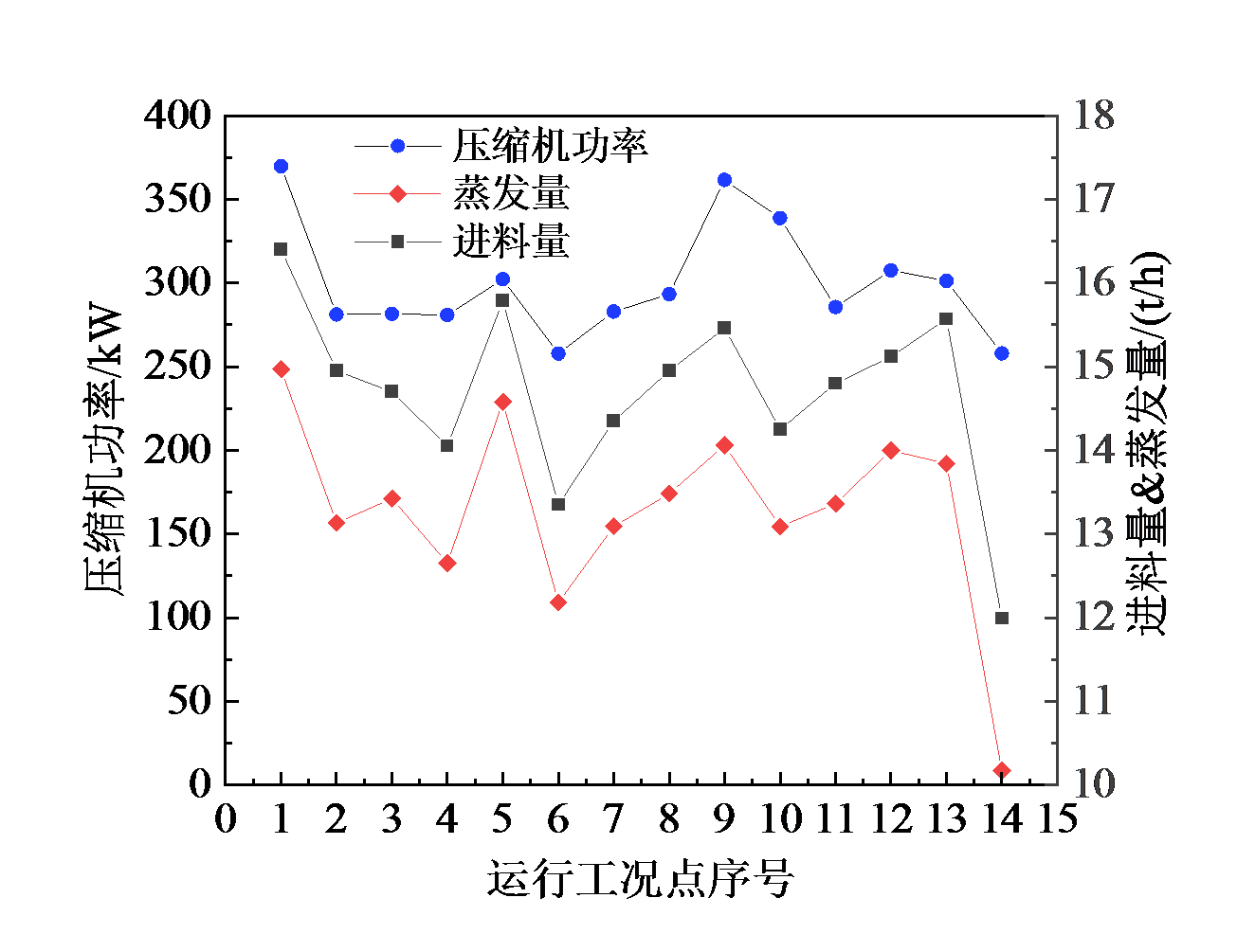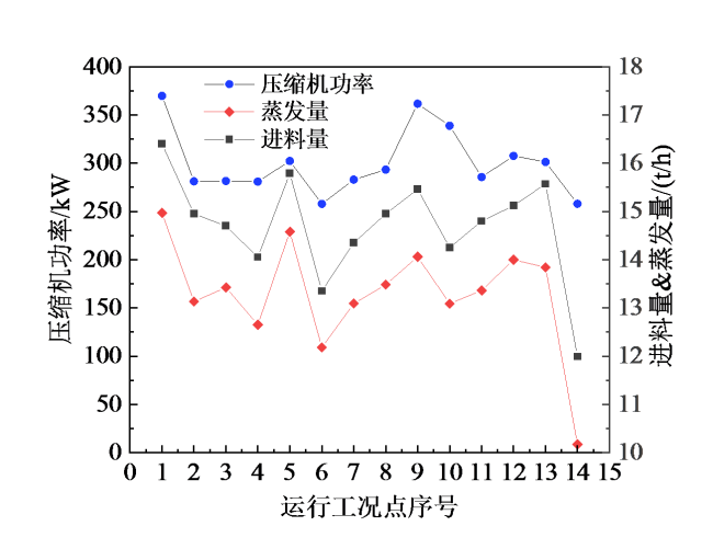 Fig. 5 Schematic diagram of the change of MVR compressor power with feed volume and evaporation volume during actual operation图5 实际运行时压缩机功率随进料量和蒸发量的变化示意图 |