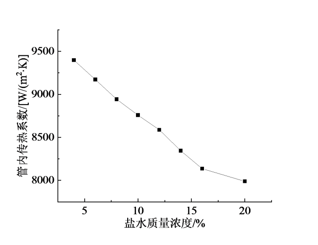 Fig. 3 Variation of heat transfer coefficient inside the tube with brine concentration图3 管内传热系数随盐水浓度变化图 |