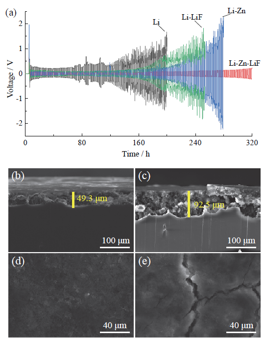 Fig. 3 (a) Charge and discharge curves in Li, Li-LiF, Li-Zn, Li-Zn-LiF symmetric cells with charge/discharge current density of 1 mA/cm2 and capacity of 1 mA∙h/cm2; SEM images of the bare lithium (c, e) and Li-Zn-LiF (b, d) electrodes after 100 cycles at 2 mA/cm2 and 1 mA∙h/cm2图 3 (a)Li、Li-LiF、Li-Zn、Li-Zn-LiF对称电池中的充放电曲线,充放电电流密度为1 mA/cm2、容量为1 mA∙h/cm2;(b、d)处理后锂金属电极和(c、e)未处理的锂金属电极经2 mA/cm2、容量为1 mA∙h/cm2条件下循环100圈后的SEM图 |