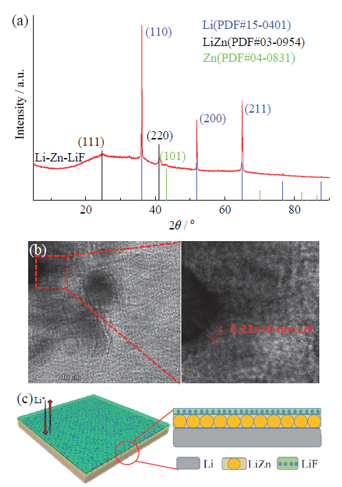 Fig. 2 (a) XRD pattern of Li-Zn-LiF electrode; (b) high resolution TEM image of Li-Zn-LiF electrode; (c) schematical illustration on the surface components of Li-Zn-LiF electrode图 2 (a)Li-Zn-LiF电极的XRD图谱;(b)Li-Zn-LiF电极的高分辨TEM图;(c)Li-Zn-LiF表面膜的结构示意图 |