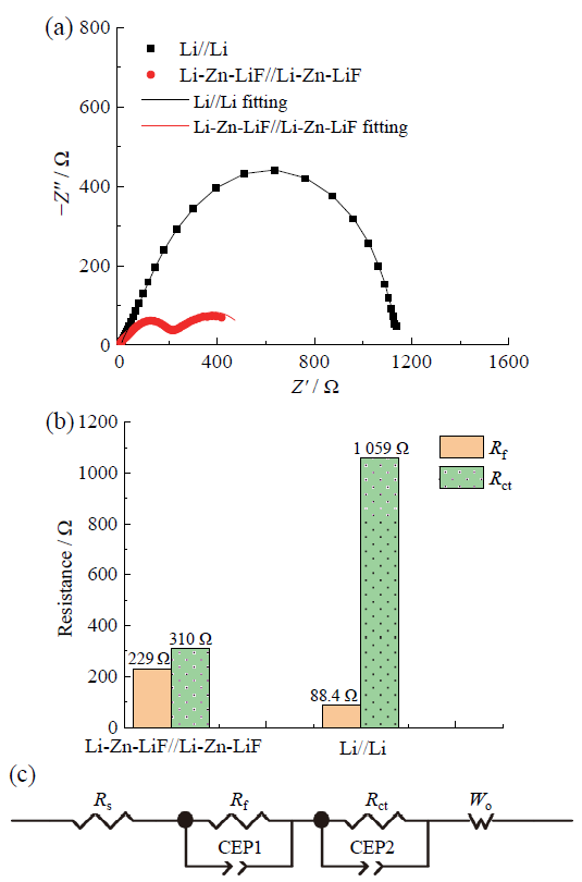 Fig. 4 (a) Electrochemical impedance spectra of Li and Li-Zn-LiF electrodes before charge/discharge cycles of Li//Li symmetric batteries; (b) film resistance (Rf) and charge transfer resistance (Rct) obtained by fitting; (c) equivalent circuit for fitting图 4 (a)Li和Li-Zn-LiF电极在Li//Li对称电池充放电循环前的电化学阻抗谱;(b)拟合得到的锂金属电极的Rf和Rct;(c)拟合用的等效电路图 |