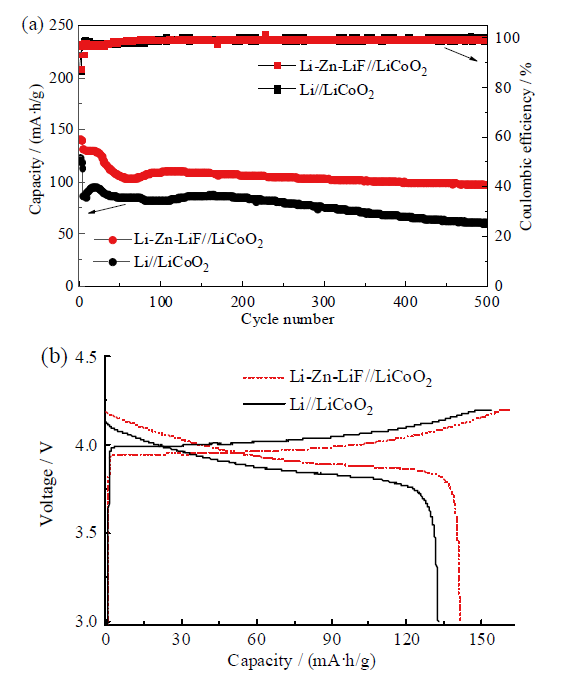 Fig. 5 Cycling stability of Li//LiCoO2 full cells using bare Li, Li-Zn-LiF anodes at 1 C: (a) evolution of discharge capacity with cycle number; (b) first circle charge/discharge curve图 5 在1 C条件下使用Li、Li-Zn-LiF阳极的Li//LiCoO2全电池的循环稳定性:(a)放电容量随循环圈数的变化;(b)首圈充放电曲线 |