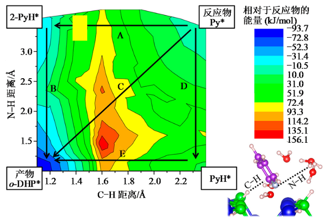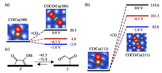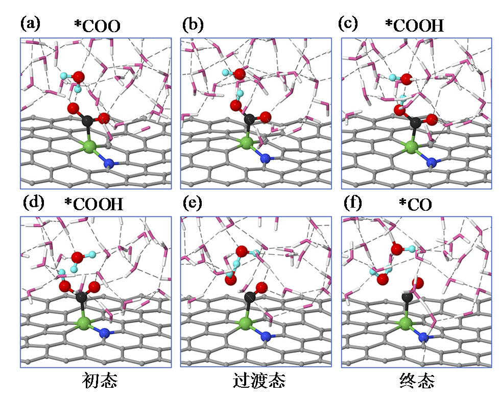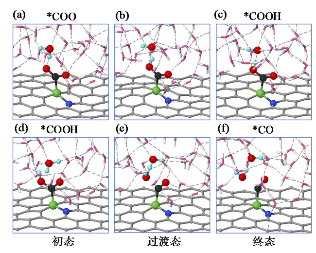 Fig. 4 Reaction pathways for *COOH formation and *CO formation on Ni-doped grapheme[23]: (a-c) initial state, transition state and final state of *CO2 + H2O + e- → *COOH* + OH-; (d-f) initial state, transition state and final state of *COOH + H2O + e- → *CO+ H2O* + OH-图4 Ni掺杂石墨烯电催化CO2还原合成CO的反应路径[23]: (a ~ c)*CO2 + H2O + e- → *COOH* + OH- 的初态、过渡态和终态;(d ~ f)*COOH + H2O + e- → *CO+ H2O* + OH-的初态、过渡态和终态 |