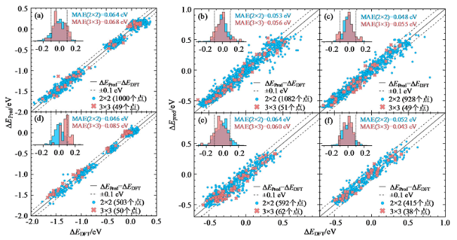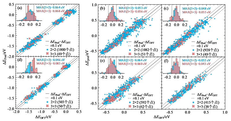 Fig. 7 DFT-calculated versus ML-predicted values of adsorption energy[31]: (a) CO adsorption energy on top site of CoCuGaNiZn; (b) H adsorption energy on fcc-hollow site of CoCuGaNiZn; (c) H adsorption energy on hcp-hollow site of CoCuGaNiZn; (d) CO adsorption energy on top site of AgAuCuPdPt; (e) H adsorption energy on fcc-hollow site of AgAuCuPdPt; (f) H adsorption energy on hcp-hollow site of AgAuCuPdPt图7 DFT计算值与ML预测值对比结果[31]:(a)CoCuGaNiZn催化剂金属顶位点的CO吸附能;(b)CoCuGaNiZn催化剂的面心立方空位点的H吸附能;(c)CoCuGaNiZn催化剂六方最密堆积空位点的H吸附能;(d)AgAuCuPdPt催化剂金属顶位点的CO吸附能;(e)AgAuCuPdPt催化剂的面心立方空位点的H吸附能;(f)AgAuCuPdPt催化剂六方最密堆积空位点的H吸附能 |