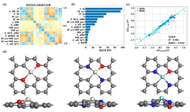 Fig. 8 ML prediction of ECR catalysts[28]: (a) Pearson correlation coefficient of features; (b) feature importance; (c) ΔGCO prediction and calculation results of XGBR algorithm vs DFT; (d) structural stability of the designed materials图8 机器学习预测ECR催化剂[28]:(a)特征的皮尔逊相关性系数;(b)特征重要性;(c)DFT与机器学习算法XGBR对ΔGCO的计算与预测结果;(d)设计材料的结构稳定性 |