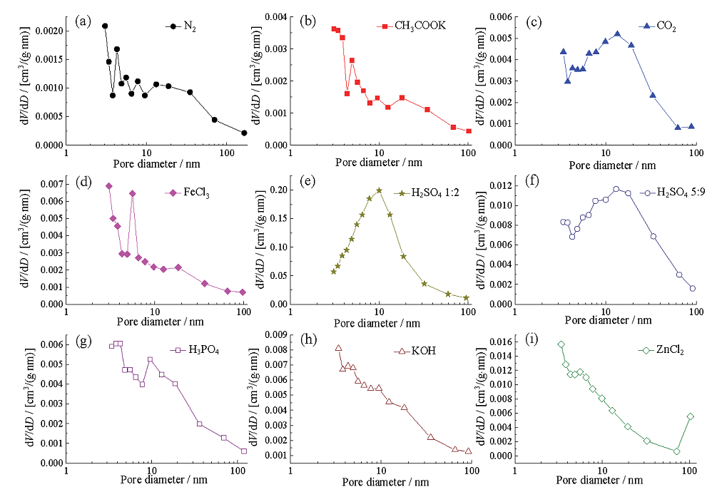 (1)污泥和H2SO4按照1: 2比例活化制得的生物炭具有最大比表面积, 为1 332.732 m2/g, 且孔径广泛分布于介孔与大孔之间。而经N2、CH3COOK和FeCl3活化后, 有利于产生< 10 nm的小介孔生物炭; 经CO2、H3PO4、KOH和ZnCl2活化后有利于3 ~ 40 nm介孔的形成。