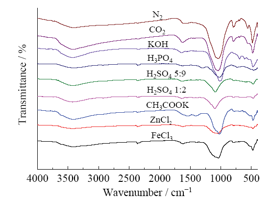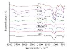 (2)H2SO4、KOH对生物炭表面官能团的影响较小, 而弱酸(H3PO4)、强碱弱酸盐(CH3COOK)活化得到的生物炭官能团种类更为丰富。