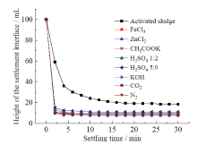 如图5时间-液面高度曲线所示, 不同活化剂活化制备的生物炭沉降性能变化趋势非常吻合, 均在2 min内基本完成了全部沉降量, 且沉降率高达45 mL/min。此外, 在观察CH3COOK和H3PO4活化生物炭调理后活性污泥沉降性能时, 其液体均呈现黑灰色。不同的是, 前者在前两分钟沉降过程中液体逐渐变得清澈, 液固界面清晰可见; 但是H3PO4活化生物炭调理后的活性污泥液体在整个观察过程一直处于浑浊状态, 无法辨认固液界面位置。