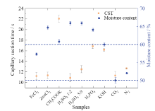| 图6 不同活化生物炭调理活性污泥CST和泥饼含水率Fig. 6 CST and cake moisture content of activated sludge with different modified biochar |