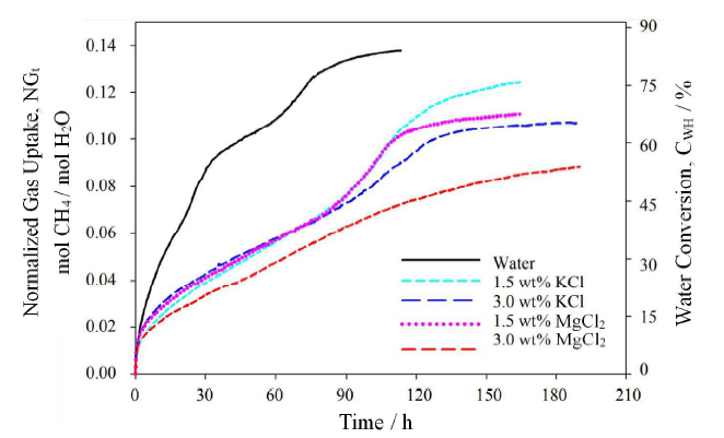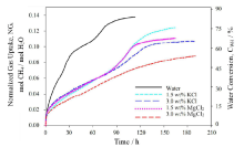 压裂液中加入黏土稳定剂可以有效抑制黏土的水化膨胀, 减少压裂液对储层渗透率的不利影响, 水力压裂中使用的黏土稳定剂种类丰富, 主要分为无机盐类、无机聚合物类、表面活性剂类和季铵盐聚合物类等[31]。对于水合物储层压裂, 黏土稳定剂首先需要具备低温有效性(< 20℃)以适应于低温水合物储层, 其次要有良好的水溶性。无机盐类黏土稳定剂主要是氯盐, 其中KCl、MgCl2、CaCl2和NH4Cl的使用较为广泛, 常规压裂液中氯盐黏土稳定剂的用量较大, 最高可达到3%。CHA[29]、MOHAMMADI等[32]、ATIK等[33]、KANG等[34]、KHARRAT等[35]研究了这一类氯盐溶液在不同浓度下甲烷水合物的相平衡条件。图10为不同种类和浓度的氯盐对相平衡的影响, 发现氯盐均表现出一定的甲烷水合物热力学抑制效应, 抑制效应随浓度增大而增大, 抑制作用由大到小的顺序大致为CaCl2> MgCl2> KCl > NH4Cl。SUN等[30]和CHONG等[36]研究了这一类无机盐溶液在硅砂多孔介质中甲烷水合物的相平衡, 0.9 mol/L的CaCl2和MgCl2在硅砂中分别使相平衡温度降低了4.38 K和5.78 K。如图11, CHONG等[36]还比较了几种体系甲烷水合物的生成动力学, 发现在有盐的条件下, 水合物生成的速率慢, 转化率低, MgCl2的抑制效果优于KCl。