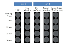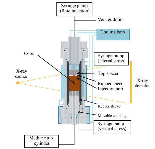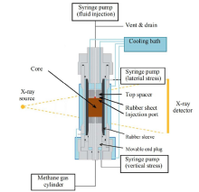 KONNO等[8]对含甲烷水合物的沉积物进行了水力压裂实验, 并测量了渗透率, 图2为实验装置, 反应釜内径50 mm、高69.9 mm, 实验在轴压和围压分别为2.1 MPa和1.1 MPa的应力下合成了含甲烷水合物沉积物, 然后使用柱塞泵将压裂液以5 mL/min的速度从柱状沉积物顶部的一个小口注入, 注入压力在增大一段时间后突降, 在距沉积物顶部0 ~ 25 mm的区域内成功诱发裂缝, 如图3所示。X射线CT扫描仪的结果显示, 裂缝在注液压力突降时产生, 其开裂方向与最小主应力方向垂直, 开裂时的注入压力比最小主应力高2.9 ~ 3.9 MPa, 压裂前后的沉积物虽未能达到理想中的固结状态, 但CT中观察到的断裂行为却产生了类似页岩水力压裂中固结岩石的断裂模式, 即拉伸破坏模式, 这一结果证明了压裂含水合物沉积物的可行性。受到含甲烷水合物沉积物低渗性的影响, 压裂后沉积物渗透率从0.000 8 mD显著升高至0.014 mD, 在外应力作用下, 裂缝在静置1天后闭合, 再次测得的渗透率未出现明显下降, 对沉积物在相同注射压力下进行二次压裂, 观察到原有裂缝重新张开并出现了裂缝扩大延伸的现象, 有效渗透率达到了4.6 mD。KONNO等认为沉积物渗透率的增加是由于水力压裂激活了晶体-晶体和晶体-砂的边界, 使胶结物质分离, 在裂缝的闭合阶段, 含水合物沉积物的凝聚和变化不足以封闭这些边界, 也无法完全堵塞气液运移通道, 这些边界是产气过程中的第一流通路径, 稳定的渗透率说明含甲烷水合物沉积物在水力压裂后, 可能并不一定需要常规水力压裂中使用的支撑剂来保持裂缝以维持渗透率; 实验结果还证明二次压裂促进了晶体-晶体和晶体-砂的进一步分裂, 使沉积物渗透率进一步升高, 可见含水合物沉积物水力压裂具有可观的增产潜力。
