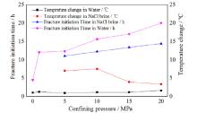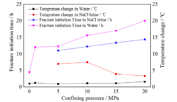 在压裂过程中, 随着围压增大, 井眼周围的裂缝分布更加均匀, 裂缝网络的弯曲度减小, 增加了裂缝的连通性, 使沉积物具有更好的气液流动性。DE SILVA等还发现盐水浓度高的压裂液有利于SCDA的填装, 并使砂样裂缝密度平均提高了38%。图6是使用水和盐水为介质的压裂液在不同围压下压裂裂缝的诱导时间, 在20 MPa围压下, 使用质量分数为20%NaCl溶液辅助SCDA压裂, 可以使起裂时间缩短33.58%, 说明3G-DTM可能在海洋环境中使用的性能更佳。此外, 在3G-DTM压裂过程中, 岩石经历了一个渐进的压裂过程(10 ~ 15 h), 这使得裂缝的扩展更加安全可控, 使得3G-DTM有望成为在海洋环境中破碎地层的一种替代技术。