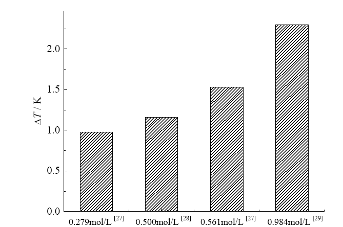 不同区域海水的盐度不同, 绝大多数区域海水盐度在3.5%左右(0.6 mol/L)[26], 海水中的盐成分主要为NaCl, 其余盐类在低浓度下对甲烷水合物的抑制效果与NaCl相近, 因此海水对水合物的相平衡影响主要取决于NaCl。如图9, SYLVA等[27]、MAEKAWA[28]和CHA[29]进行了不同浓度NaCl对甲烷水合物相平衡影响的研究, 发现在恒压状况下, 0.279 ~ 0.984 mol/L的NaCl溶液使相平衡温度降低了1 ~ 2.5 K, 盐浓度越大, 对水合物的热力学抑制效果越强。SUN等[30]探究了盐溶液在含硅砂和黏土的多孔介质沉积物中水合物的相平衡, 发现盐度在2.84% ~ 5.53%的NaCl溶液在恒压条件下使体系的相平衡温度降低了1 ~ 3 K, 可见盐对沉积物孔隙中的水合物也有热力学抑制效果。