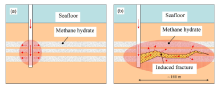 页岩气藏等非常规低渗透油气藏通过水力压裂技术实现了油气增产[4], 因此科研人员也开始考虑同为低渗透气藏的水合物矿藏是否也可以使用水力压裂技术提升产量。水力压裂技术是通过向储层注入大量压裂液, 扩展储层内的天然裂缝, 生成水力裂缝, 人为地增加气液运移通道, 扩大井筒面积, 提高渗透率和传热传质效率, 进而使油气产量大幅增加的技术[5]。水合物储层主要由黏土、粉砂和粗砂组成, 水合物晶体离散地分布于沉积物的孔隙和裂隙中, 在较高的水合物饱和度条件下, 水合物可以对储层起到良好的胶结粘连作用[6], 使高密实的沉积物具有类似于粉砂质页岩气藏的力学特性, 进而使沉积物具有被诱导出水力裂缝的可能性。图1是诱导裂缝对水合物开采的影响[7], 可见裂缝增大了解离面积, 加速了传热传质效率, 使水合物快速解离, 提高了采收率, 因此水合物矿藏的水力压裂研究成了当前油气科学领域的新课题。国内外研究者从多个角度对水力压裂技术应用于水合物储层进行了探索性的研究, 本文总结了当前压裂实验、数值模拟和压裂液的研究进展, 讨论了天然气水合物储层压裂需要关注的问题和难点, 提出了下一步的研究方向, 为今后该领域的研究提供参考。