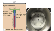 TOO等[9, 10, 11]合成了直径80 mm、高150 mm的圆柱形含水合物沉积物试样, 使用被埋在湿砂试样中的薄塑料板模拟了水合物储层中的天然裂缝, 被预置在湿砂中的水力注射管直接伸向薄塑料板, 垂直对准“ 裂缝” 注液, 来模拟天然裂缝的扩展, 如图4所示。破裂压力pb为: