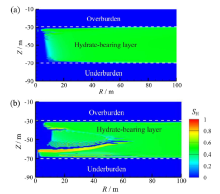 ![]() | 图7 低温水合物矿藏连续生产8年后的水合物饱和度分布[16]:(a)未压裂的储层; (b)被压裂的储层Fig. 7 Distribution of hydrate saturation after 8 years of continuous production in low-temperature hydrate deposits[16]: (a) unfractured reservoirs; (b) fractured reservoirs |