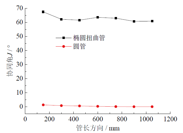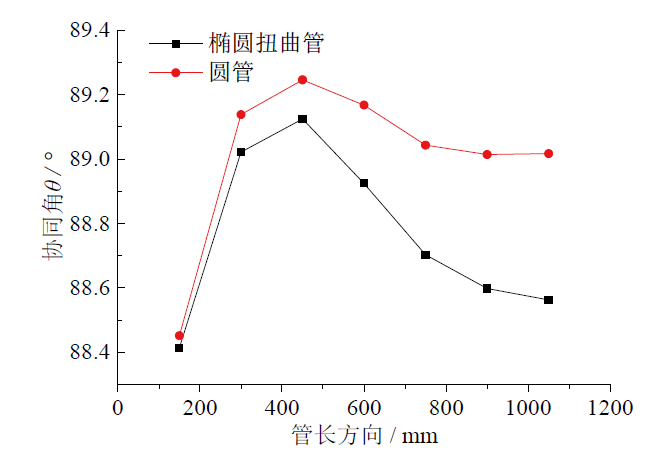 图8是流体速度与温度梯度协同角沿管长方向的变化情况, 从图中可以发现圆管与椭圆扭曲管的速度与温度梯度协同角沿管长方向变化趋势基本一致, 协同角在100 ~ 300 mm范围内急剧增大, 在300 ~ 500 mm范围内增幅减小, 而在500 mm之后有所下降。此外, 在椭圆扭曲管内协同角始终比圆管的小, 说明椭圆扭曲管内流体的速度场与温度场协同性优于圆管, 更加利于热量的传递和换热效果的提升。在椭圆扭曲管内协同角的平均值为88.8° , 比圆管低0.2° 。