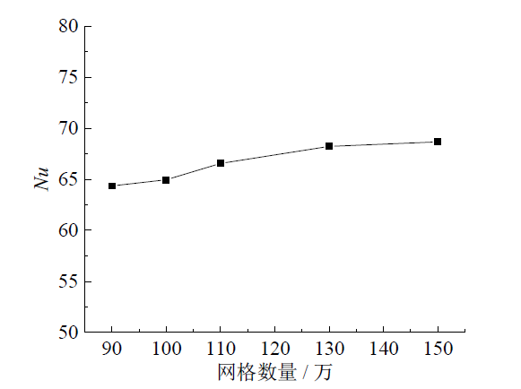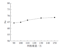 对模型进行数值计算之前需对网格的无关性进行验证, 在保证计算精度的条件下尽量减少计算时间。对近壁处的网格进行不同程度的加密, 得到的网格数量分别为90万、100万、110万、130万和150万, 图3显示了不同网格数量下椭圆扭曲管内努塞尔数Nu的变化情况。由图中可以看出, 当网格数量从130万变化到150万时, 努塞尔数从68.2变化到了68.7, 仅增长了0.7%, 因此选用的计算网格数量为130万。