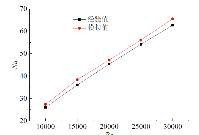 为保证计算模型的准确性, 在不同雷诺数下对圆管进行数值模拟, 将模拟的结果与前人的经验公式进行比较, 此处经验公式为Nu = 0.023Re0.8Pr0.4, 雷诺数Re = 1× 104~ 1.2× 105, 普朗特数Pr = 0.7 ~ 120, l/d ≥ 60[13]。