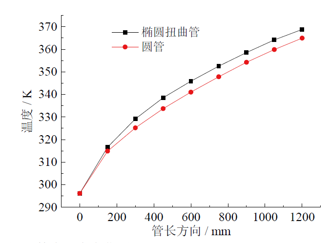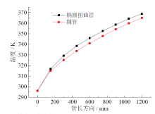 从图6中可以看出, 沿着工质流动的方向, 工质吸收从管壁传来的热量, 温度逐渐上升, 但温度的变化率逐渐降低, 说明流体吸收的热量越来越少。这主要是由于空气进入管子与管壁热交换时, 有入口段的存在, 入口段的热边界层较薄, 局部表面传热系数比充分发展段的高, 而且工质温度与管壁温差较大, 所以吸热速度快; 随着空气在管内流动, 逐渐进入充分发展段, 热边界层厚度逐渐增长并趋于稳定, 空气温度逐渐上升, 与管壁温差逐渐减小, 吸收的热量也逐渐减少。此外, 椭圆扭曲管内流体温度始终比圆管的高, 说明流体在椭圆扭曲管内升温更快, 吸热更多, 换热效果更好。