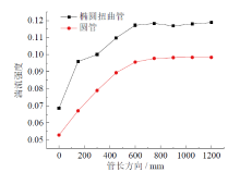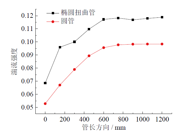 湍流强度是反映流体湍流运动特性最重要的特征量, 等于湍流脉动速度与平均速度的比值, 反映了脉动速度的相对强度。图7是流体湍流强度沿管长方向的变化情况, 从图中可以看出椭圆扭曲管和圆管的湍流强度沿管长方向变化趋势一致, 沿管长方向0 ~ 600 mm范围内, 湍流强度逐渐增大, 600 mm之后基本趋于稳定。椭圆扭曲管的湍流强度始终比圆管的高, 说明在椭圆扭曲管内流体所受到的扰动更为强烈, 从而有利于破坏流体边界层, 提高流体的传热效率。在椭圆扭曲管内湍流强度的平均值为0.107, 比圆管的高24%。
