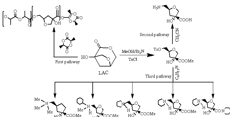 LAC独特的手性多功能骨架结构, 使其可以作为手性合成子合成具有独特性能的手性化合物, 如糖氨基酸等。DEFANT等[11]以LAC为起始原料, 首先利用其刚性的四氢呋喃环构建了糖氨基酸的杂氧环结构, 然后在LAC手性结构的基础上引入氨基和羧基, 合成了一种新的糖氨基酸(图1中路径二)。该糖氨基酸是一类重要的碳水化合物, 由于其独特的手性结构和四氢呋喃环, 使其在空间位阻的效应下形成了旋光异构型产物, 在制备糖类[14]和肽类药品[15]中具有重要的作用。此外, LAC也可以用于制备毒蝇碱类化合物。毒蝇碱类是一种广泛存在于人体中枢神经系统中的受体, 其主要功能是对记忆信息进行传递[12], 该化合物可用于合成治疗阿尔兹海默症和其他认知障碍类疾病的药物, 在医学研究上具有非常重要的价值。将LAC单体作为起始原料, 以其四氢呋喃环的骨架结构为基础, 加入4-甲苯磺酰氯(tosyl chloride, TsCl)获得上述DEFANT等所制备的糖氨基酸的前体物质, 然后在三乙胺存在的条件下发生取代反应, 获得具有五类对映异构体的毒蝇碱类化合物(图1中路径三), 其产率可高达49.52%(若无特殊说明, 均指质量百分数)[16]。