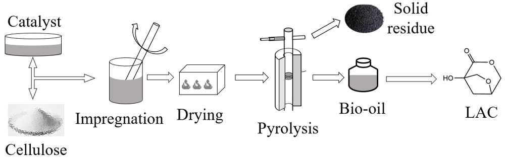 | 图5 基于湿法混合催化剂的纤维素热解制备LAC工艺流程Fig. 5 The technological process of pyrolysis of cellulose impregnated with catalyst for LAC production |
