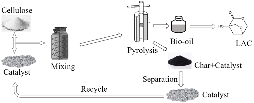 | 图6 基于机械掺混催化剂的纤维素热解制备LAC工艺流程Fig. 6 The technological process of pyrolysis of cellulose mixing with catalyst for LAC production |