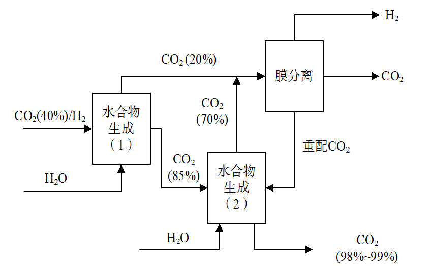 | 图3 水合物法二级分离结合膜分离法从燃料气中分离CO2[25]Fig. 3 Process of CO2 separation from IGCC gas by 2 stages of hydrate combined with membrane method[25] |