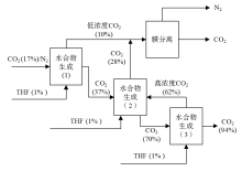 | 图2 水合物法三级分离结合膜分离法从烟气中分离CO2[24]Fig. 2 Process of CO2 separation from flue gas by 3 stages of hydrate combined with membrane method[24] |