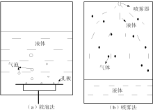 LI等[37]进行了CO2水合物的生成速度与搅拌速度之间关系的实验[37], 结果表明通过搅拌反应器内气体循环和机械搅拌, 可将CO2水合物生成诱导时间从261 min降至24 min, 即该装置能显著减少CO2水合物成核时间。LINGA等[17]使用模块化机械搅拌气体诱导结晶器的新设备用于演示通过生成水合物捕集CO2的过程, 该装置通过机械搅拌改善了气液接触, 因此水合物结晶速率增加。通过装置中间的轴和进气叶轮的特殊设置使得当在一定压力下进行实验时, 允许气体从顶部空间通过轴进入流经螺旋桨叶片的液体。与在较小规模的搅拌釜反应器中获得的结果相比, 该装置的气体吸收率和分离效率更高。搅拌装置的优点是能增加气液接触促进水转化为水合物, 缺点是搅拌需要额外能耗, 若水合物法应用于工业则搅拌方法不适用, 鼓泡法和喷雾法虽然也能增加气液接触促进水转化为水合物, 但也存在相同的能耗问题。鼓泡法和喷雾法示意图见图4。