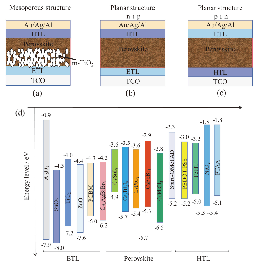 各层材料的选择对全无机钙钛矿太阳能电池的性能至关重要, 除能级匹配外, 对于n-i-p型结构, 电子传输层应具有高光透过率, 空穴传输层应具有高稳定性等优点。图1d列举了目前全无机钙钛矿太阳能电池各层较常用材料的能级结构示意图, 图中给出了各种材料的最高电子占据轨道(highest occupied molecular orbital, HOMO)能级和最低电子未占据轨道(lowest unoccupied molecular orbital, LUMO)能级。根据能级匹配原则, 界面处的自由电子会流向更低LUMO能级的材料, 而自由空穴会流向更高HOMO能级的材料。因此通过对各层材料进行合适的选择, 可以有效改善开路电压等参数性能, 获得更高的光电转换效率。