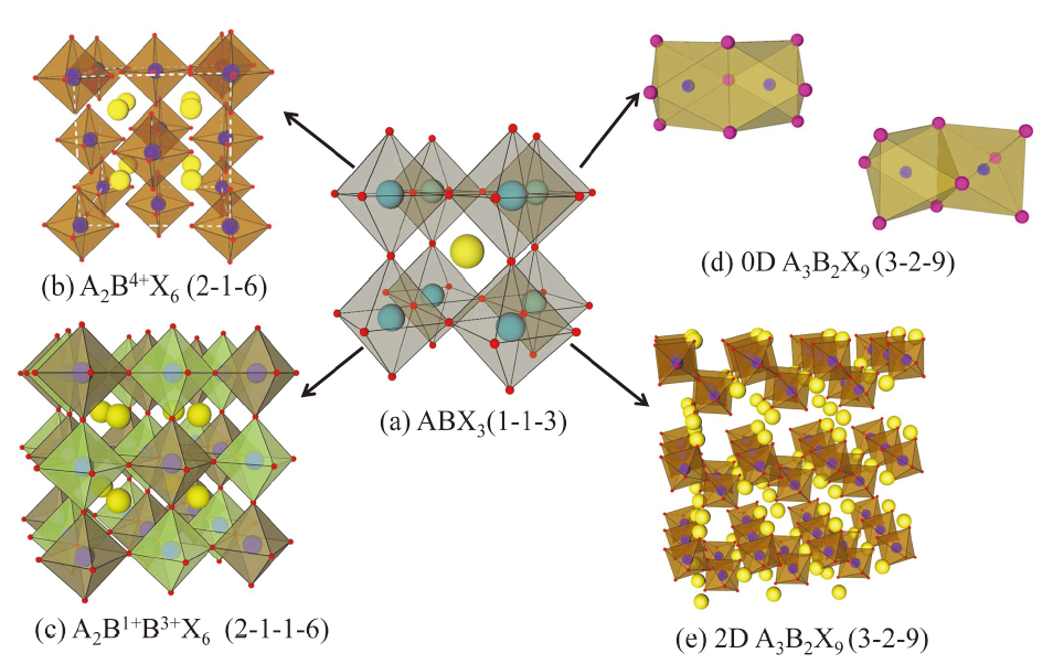 不同结构全无机钙钛矿材料主要指的是晶体结构为ABX3、A2BX6(2-1-6)、A2B1+B3+X6(2-1-1-6)、类钙钛矿如A3B2X9(3-2-9)的钙钛矿材料, 具体晶体结构如图2所示。ABX3型材料(图2a)是传统的三维正八面体结构(A位于八面体间隙中, B位于八面体体心, X位于八面体各个顶点位置), 具备高对称性, 结构的理化性质优异。而A2BX6和A2B1+B3+X6结构都属于双钙钛矿结构, A2BX6(图2b)通过在B位交替形成一个空位和一个 +4阳离子维持电中性条件, 但空位的形成会降低原有的三维钙钛矿结构的维度, 影响材料的光电性能; 为了弥补A2BX6这一缺陷, A2B1+B3+X6(图2c)通过一个+1价阳离子和 +3价阳离子交替排列维持电中性条件, 在一定条件下也能维持三维结构, 但是由于离子半径和键长差异导致材料结构畸变, 进而造成光电性能的改变。除此之外, A3B2X9结构是类钙钛矿结构(图2d和图2e), 通常是零维或者二维层状结构, 因此诸多性能与ABX3型也有较大差别。下面分别介绍不同类型材料及其太阳能电池性能。
