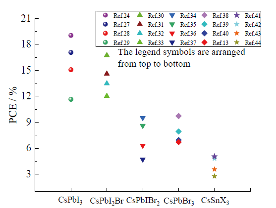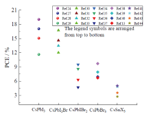 ![]() | 图3 ABX3型无机钙钛矿材料在不同器件构型的效率特性Fig. 3 Efficiency characteristics of ABX3 type inorganic perovskite materials in different device configurations |