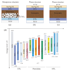 目前钙钛矿太阳能电池的结构是以染料敏化太阳能电池的结构衍生而来, 主要分为介孔结构和平面结构两大类, 主要区别是电子传输层除了致密层外, 是否包括介孔层作为骨架支撑结构, 如图1a所示。介孔结构由于介孔层如二氧化钛的存在, 可以更有效地收集钙钛矿层所产生的光生电子, 但平面结构的制备方法简单, 可以低温制备, 适用性强, 经济成本更低, 因而应用更为广泛。目前常见的平面结构包括正置n-i-p结构[11]和反置p-i-n结构[12](如图1b和图1c)。