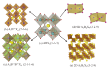 类钙钛矿材料, 或钙钛矿衍生物。可以理解为从顶层的钙钛矿中衍生出来, 其中A3B2X9构型(如图2d和图2e)是最常见的类钙钛矿材料, 其结构为每三个ABX3去除一个B位阳离子。在缺失一个B位阳离子的情况下, 要保证电中性原则, 其他B位阳离子必须处于 +3氧化状态, 因此B位阳离子通常为Bi3+、Sb3+。由于Bi3+的核外电子排布与Pb2+一致(6s2 6p0 ), 离子半径差距小, 电负性接近, 因此基于Bi3+的钙钛矿材料的结构很稳定, 而且在带隙可调及溶液加工等方面, 与铅基钙钛矿相似, 成为替代铅基钙钛矿的重要候选材料[56]。