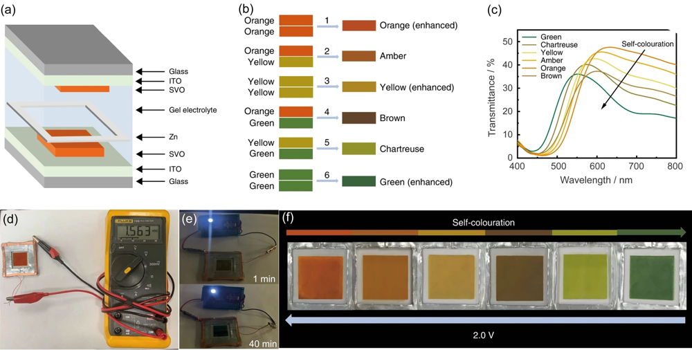 ![]() | 图5 (a)多色电色器件原理图; (b)颜色堆叠原理与六色效果; (c)不同颜色状态下的器件透射光谱; (d)器件在橙色状态下的开路电压; (e)器件在放电状态下为LED供能40 min; (f)器件在不同颜色状态下的照片[54]Fig. 5 (a) Schematic diagram of multicolor electrochromatic device; (b) color stacking principle and six-color effect; (c) transmission spectra of devices in different color states; (d) the open-circuit voltage of the device in the orange state; (e) the device can supply power for LED for 40 minutes in the discharge state; (f) photos of devices in different color states[54] |