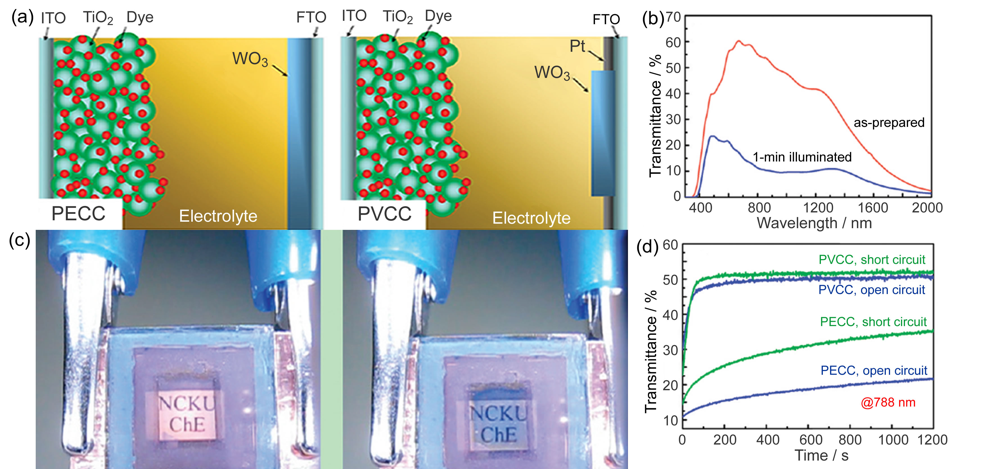 ![]() | 图6 (a)PECC和PVCC原理图; (b)PECC在开路状态下, 准备状态和着色态的透射光谱; (c)PVCC在准备状态(左)和着色态(右)的照片; (d)PECC与PVCC在黑暗状态下对788 nm波长光的漂白进程[7]Fig. 6 (a) Schematics of PECC and PVCC; (b) transmittance spectra of PECC in the as-prepared and the colored states, measured at open circuit; (c) photographs of PVCC in the as-prepared (left) and colored (right) states; (d) evolutions of cell bleaching at a wavelength of 788 nm for open- and short-circuited PECC and PVCC in the dark[7] |