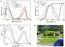除对电极以外, 染料在可见光区的吸收峰也会阻碍器件的透明度。即使对电极能做到极高的透明度, 但整体器件往往很难在保证高效光伏输出的同时, 保留高度透明性。基于染料的设计, 2014年, ZHANG等[17]混合调配了紫外吸收染料与红外吸收染料, 混合染料在人眼光敏波段几乎没有光吸收, 整体器件的AVT高达60.3%, 此时器件的效率为3.6%(图1)。文章对比了混合染料与常用染料N719在相同效率下的透明度, 结果表明混合染料的透明性更好。此外, 碘系电解质在电池工作中伴随生成碘单质的副反应, 会引入额外的吸收峰, 影响器件透明度。KAVAN等[18]将Co系电解质替代碘, 装配的器件在550 nm处有66%的光学透过率, 且具有9%的PCE, 该研究组还证明了Co系电解质更适用于碳基对电极, 为碳基对电极的优化提供了方向。对半透明DSSC而言, 器件透明程度与光伏性能的平衡是优化研究者应该重点考虑的问题, 进一步提高两个性能的平衡点有利于将DSSC用于光伏智能窗时为变色工作稳定供能, 同时保证优异的光学调制性能。