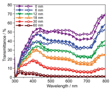 ![]() | 图2 不同银电极厚度的ST-OPV透射光谱[25]Fig. 2 Transmittance spectra of ST-OPV with different Ag electrode thinkness[25] |