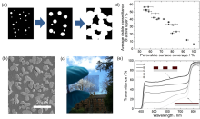 ![]() | 图3 (a)薄膜去湿过程示意图; (b)在涂层FTO衬底上的岛状钙钛矿薄膜的顶表面扫描电子显微图; (c)玻璃上的岛状半透明钙钛矿薄膜照片, 展示了中性色和半透明; (d)光敏层的平均可见光透过率与钙钛矿表面覆盖关系; (e)去湿钙钛矿器件的光敏层透射光谱[32]Fig. 3 (a) Schematic of the film dewetting process showing morphology change over time, from as-cast film to discrete islands; (b) scanning electron micrograph of the top surface of a representative film of perovskite islands on a TiO2-coated FTO substrate; (c) photograph through a typical semitransparent perovskite film formed on glass, demonstrating neutral color and semitransparency; (d) dependence of average visible transmittance of the active layer on perovskite surface coverage; (e) transmittance spectra of active layers of a selection of dewet perovskite devices[32] |