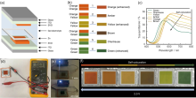 电致变色层(EC)也是PECD的核心单元之一。近些年随着对EC层的不断优化, 研究者们探索出另一个有效优化器件变色性能的方向。最早使用的EC材料为非晶态WO3, 通过外加偏压与阳离子嵌脱能在白色/蓝色间实现平稳地漂白/着色, 是绝大多数PECD使用的EC材料。但WO3在进行高通量离子嵌脱时会产生深度离子捕获, 体积相变等问题影响循环稳定性与可逆程度[51, 52]。除此之外, 一些功能性的需求也使得其他变色材料如普鲁士蓝(prussian blue, PB)、钒氧化物、氧化镍等受到广泛关注。2020年, LI等[53]介绍了一种以Zn网格为阳极、以PB为阴极的电致变色设备, 并引用K+/Zn2+作为电解质体系, 在此基础上使用PV作为外部供能器件, 虽未能实现光伏器件与电致变色设备一体化, 但是得到了具有优异CE与ST的器件。同年, ZHANG等[54]通过引用钒氧化物作为EC阴极实现了电池的三色转换, 同时通过颜色堆叠层实现多重变色(图5), 该设备在不同偏置下能表现出六种不同着色, 并拥有20%的对比度。SUN等[55]则设计了具有荧光调制发射功能的电致变色器件。器件能在紫外光的激发下呈现不同的变色现象, 放电过程进行时, 器件最终转变为蓝色并使荧光发射变弱直至淬灭, 光充电的过程则使荧光调制能力恢复。应该指出的是, 这些功能性的电致变色设备并未能实现与PV设备的一体化, 但其更多地展示了光电致变色器件在功能性的拓展, 也揭示了光伏智能窗更多元的发展方向。除了无机电致变色材料, 一些有机变色材料如PANI、PEDOT等也占据EC材料研究领域的重要部分, 并以其成本低廉、合成简单等优势吸引研究者们不断深入研究[56, 57]。