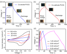 ![]() | 图7 (a)共阳极PVCS和(b)共阴极器件在100 s内进行光充电和放电的V-t曲线, 以0.1 mA / cm2的电流密度进行处理; (c)WO3-ECS的CV曲线和(d)GCD曲线[61]Fig. 7 (a) The V-t curves of the co-anode PVCS and (b) co-cathode devices for the photocharging process within 100 s and discharging process at a current density of 0.1 mA/cm2; (c) CV curves and (d) GCD curves of a WO3-ECS[61] |