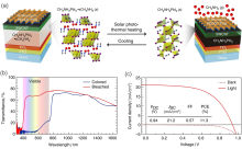![]() | 图8 (a)可切换光伏热致变色器件的原理图与转换过程; (b)器件在漂白态(红线)与着色态(蓝线)下的透射光谱; (c)器件在黑暗环境(虚线)与光照条件(实线)下的电流密度-电压关系(插图显示了着色态的PV性能指标)[8]Fig. 8 (a) Schematic of PV window device architecture and switching process; (b) transmittance of PV devices in the bleached (red) and colored (blue) states as a function of wavelength; (c) current density as a function of voltage of the champion switchable PV device in the dark (dashed) and under illumination (solid) (the inset table shows PV performance metrics of the device before being bleached)[8] |