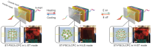 ![]() | 图9 光伏智能窗在低温透明模式、高温光散射模式、高温透明模式下的工作原理与不同模式间的转换过程[69]Fig. 9 Working principle of the SPWs at three different modes, L-ST, H-LS, and H-ST, and reversible switching behaviors between different modes[69] |