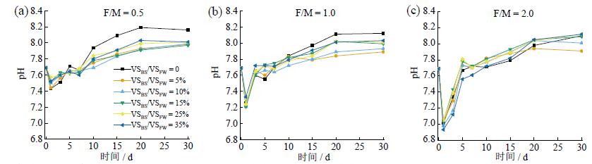 |  | 图2 厌氧发酵过程中pH的变化:(a)F/M = 0.5; (b)F/M = 1.0; (c)F/M = 2.0Fig. 2 Variation of pH during anaerobic digestion: (a) F/M = 0.5; (b) F/M = 1.0; (c) F/M = 2 |