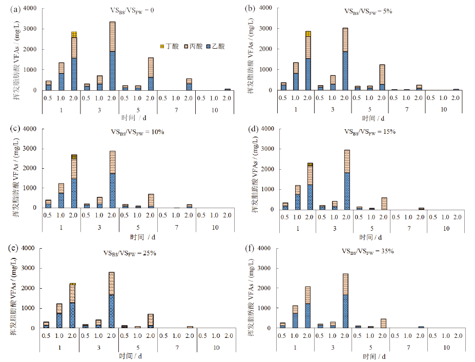 实验设置三组F/M(0.5、1.0、2.0), 根据预实验强化菌系的添加效果和经济性考虑, 在每组F/M下添加菌剂和餐厨垃圾挥发性固体(volatile solid, VS)比(VSBS/VSFW)设置为0、5%、10%、15%、25%、35%的生物强化菌剂, 对照组只添加接种物, 以消除接种物对整个发酵进程的影响。每个实验组设置两个平行。